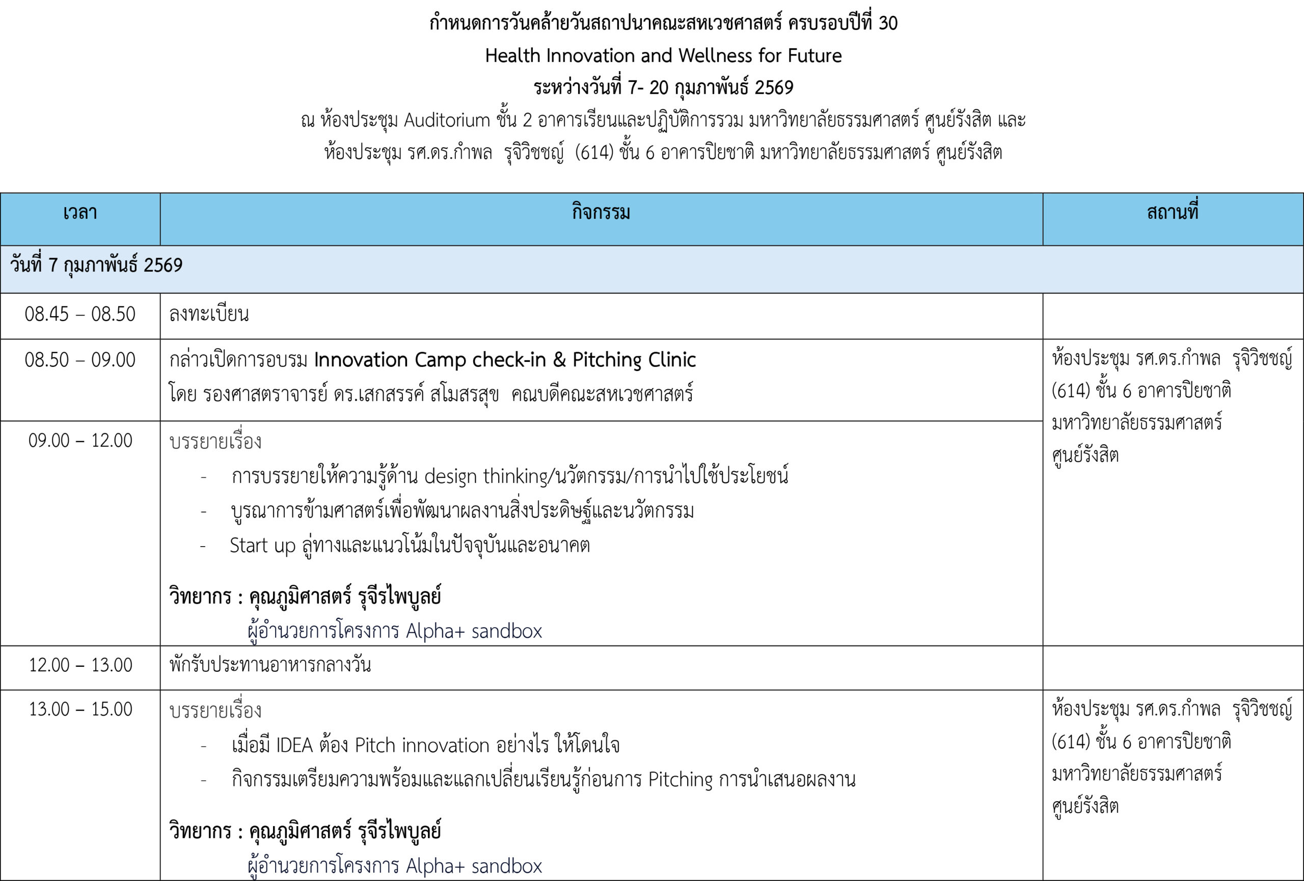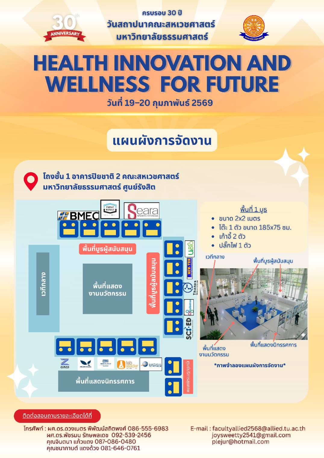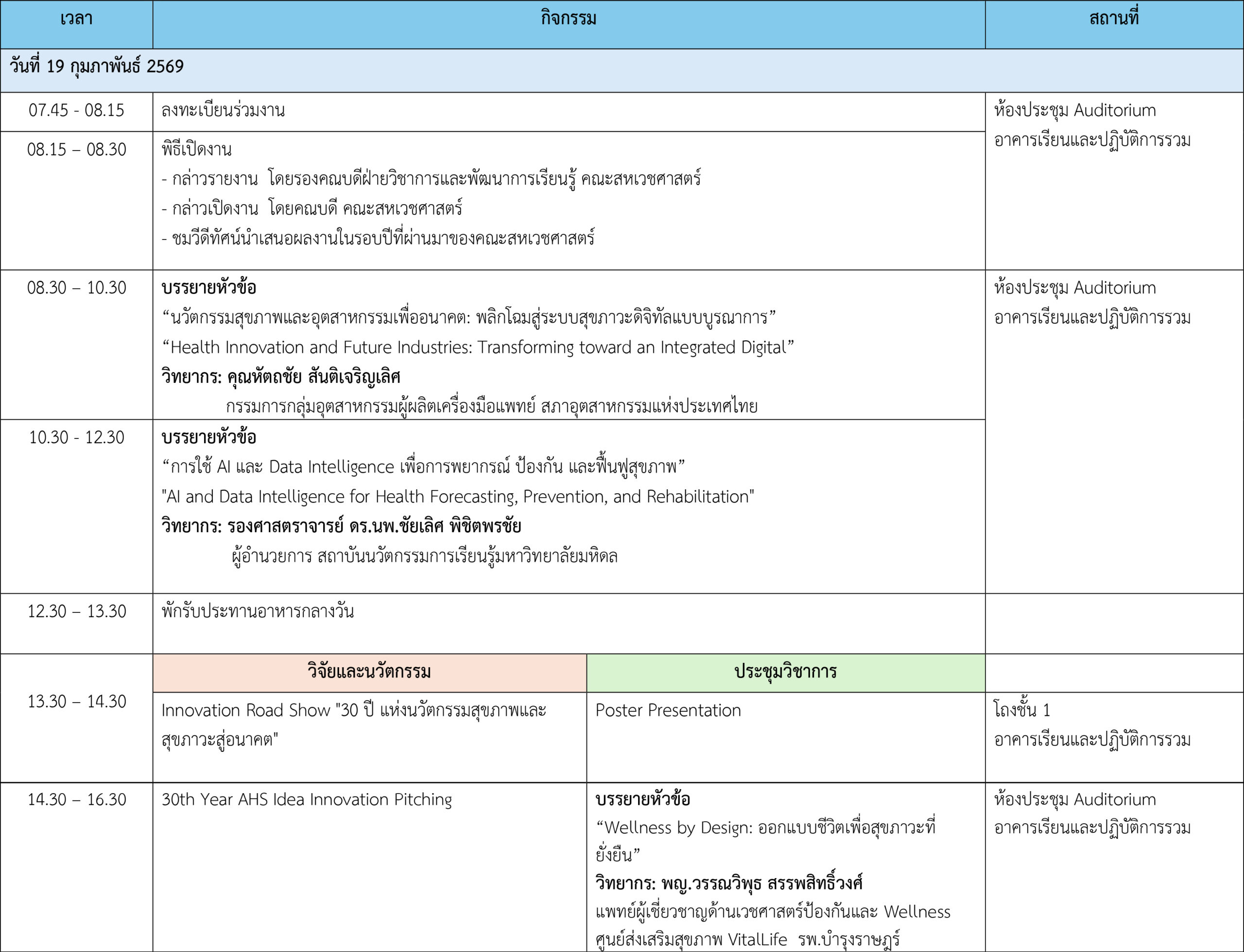 ความรู้ทางด้านวิทยาศาสตร์สุขภาพและการแพทย์มีการพัฒนาอย่างรวดเร็วและต่อเนื่อง โดยเฉพาะอย่างยิ่งในยุคที่นวัตกรรม เทคโนโลยี และข้อมูลสุขภาพเข้ามามีบทบาทสำคัญในการยกระดับคุณภาพชีวิตของประชาชน การแลกเปลี่ยนองค์ความรู้ทางวิชาการและการวิจัยผ่านกิจกรรมต่าง ๆ เช่น การบรรยาย การอบรมเชิงปฏิบัติการ และการนำเสนอผลงานวิจัย ถือเป็นกลไกสำคัญในการส่งเสริมการพัฒนาองค์ความรู้ใหม่ให้เท่าทันต่อการเปลี่ยนแปลงดังกล่าว คณะสหเวชศาสตร์ มหาวิทยาลัยธรรมศาสตร์ จึงได้จัดโครงการ “การประชุมวิชาการคณะสหเวชศาสตร์” เนื่องในโอกาสวันคล้ายวันสถาปนาคณะ ภายใต้หัวข้อ “Health Innovation and Wellness for Future” เพื่อเป็นเวทีให้คณาจารย์ นักวิชาการ นักวิจัย นักศึกษา และผู้สนใจ ได้มีโอกาสแลกเปลี่ยนเรียนรู้ประสบการณ์และองค์ความรู้ด้านวิชาการและวิจัยในสาขาสหเวชศาสตร์ รวมถึงสาขาที่เกี่ยวข้องกับนวัตกรรมสุขภาพ การส่งเสริมสุขภาวะ และเทคโนโลยีทางการแพทย์จากหน่วยงานทั้งในและต่างประเทศ การประชุมครั้งนี้จะช่วยเสริมสร้างเครือข่ายความร่วมมือทางวิชาการและงานวิจัยระหว่าง คณะสหเวชศาสตร์กับสถาบันต่าง ๆ ตลอดจนกระตุ้นให้เกิดแนวคิดและนวัตกรรมใหม่ ๆ ที่สามารถประยุกต์ใช้เพื่อพัฒนาคุณภาพชีวิตและสุขภาวะของประชาชนได้อย่างยั่งยืนในอนาคต
