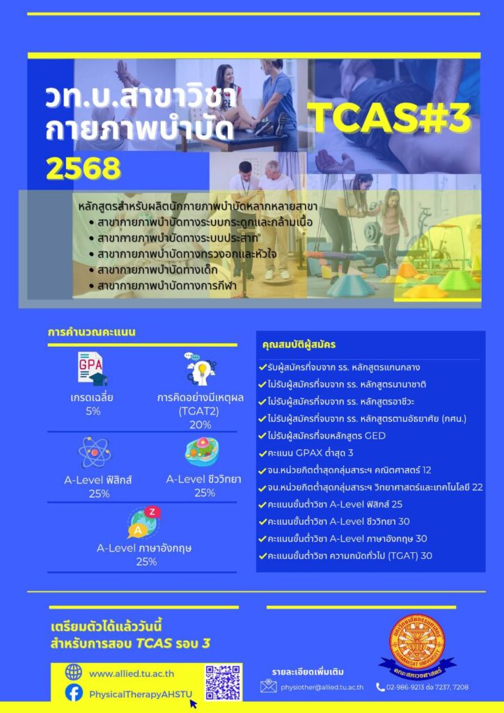 สำหรับน้องๆ ที่มีความฝันอยากเป็น “นักกายภาพบำบัดมืออาชีพ” ตรวจสอบคุณสมบัติของตนเองได้ที่นี่ แล้วเตรียมตัวให้พร้อมกับ TCAS รอบ 3 แล้วพบกัน